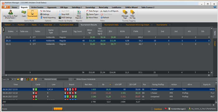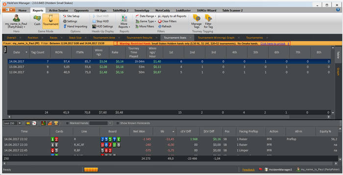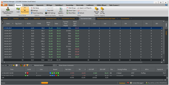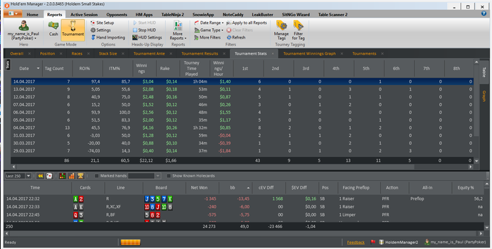 Отыграл уже 56 туриков: 48 тур 6 max 0.22$; 6 тур. 6 max 0.11( начало настраивал HM, и т.д) 2 тур HU all-in 0.22$ (чисто случайно). Начал болг не с начал, так что выложу фотки на данный момент как дела обстоят. Начало марафон немного не задалось. Т.к. привыкла к новому для себя руму, да и не играл уже пол года как))) так что втягивался недельку. В основном запускал не больше 4 туриков, да и 4 турика довольно тяжко давались еще и с хадом то полным. Глаза разбегались. На второй неделе стало уже более комфортно, вспоминаю потихоньку былые времена. По дальнейшим планам, сообщу как выполню этот)))) Планов и целей очень много и довольно интересных.