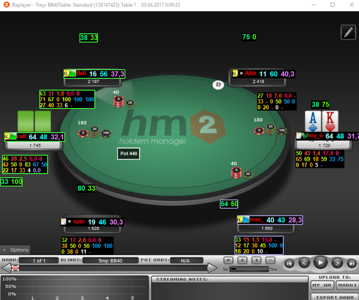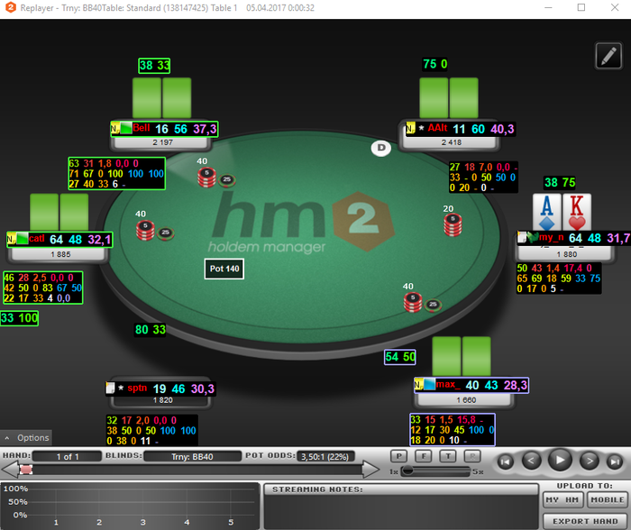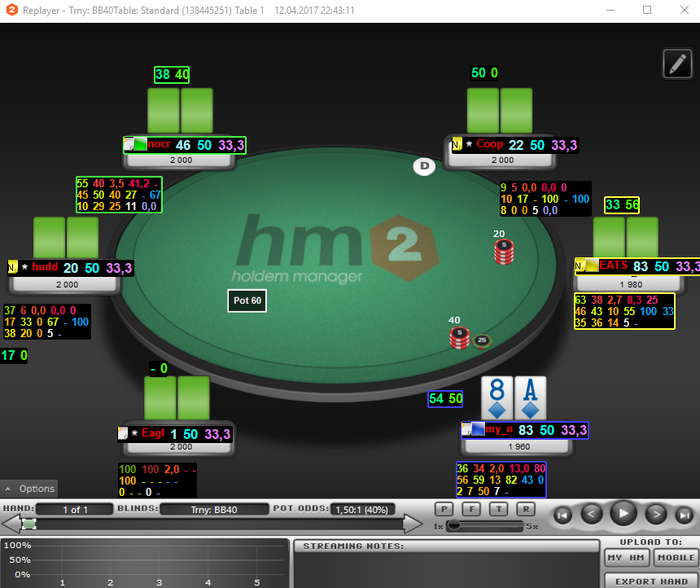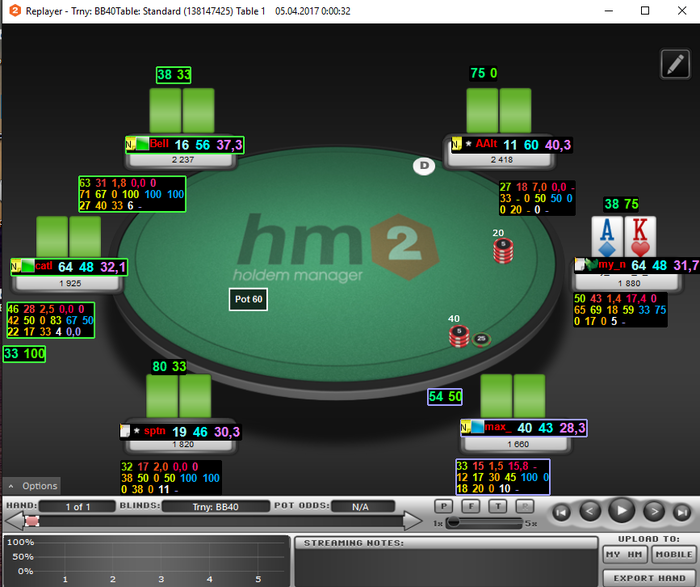 Отыграл уже 56 туриков: 48 тур 6 max 0.22$; 6 тур. 6 max 0.11( начало настраивал HM, и т.д) 2 тур HU all-in 0.22$ (чисто случайно).