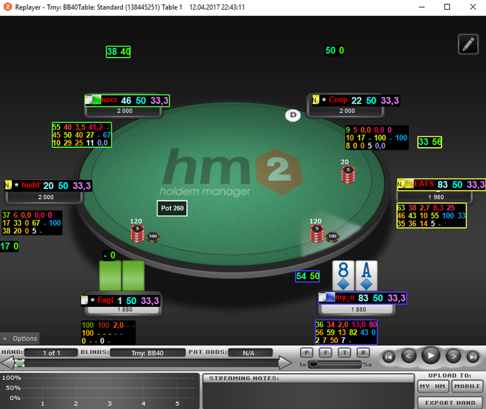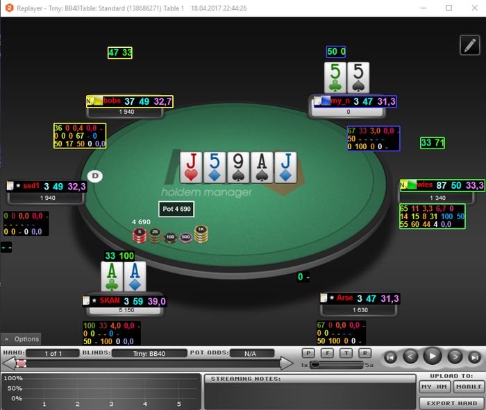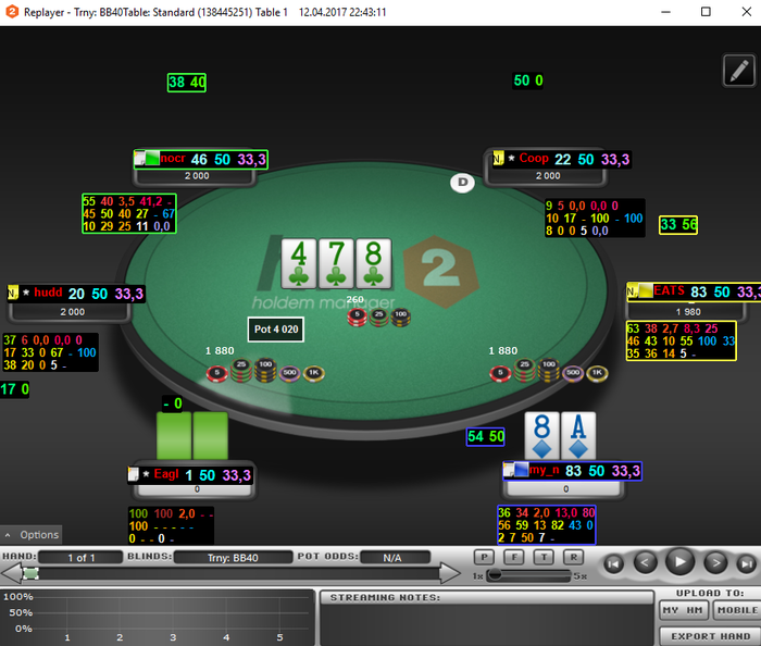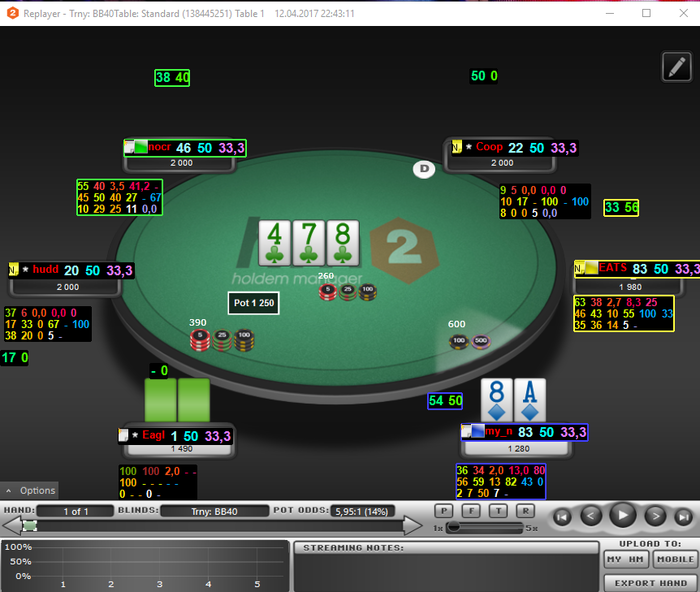 07/04/17Конец недели. Предварительный итоги Вытащили рой в плюс, Roi 12%. Если сравнить с прошло то -35% где то было. Растем) Не срываюсь, строго соблюдаю план. Если только иного получается чуть позднее сессии начинать, чем планировал. Сегодня на 15 минуть перенес сессию. Так то ни чего серьезного, в сон клонило под конец сессии. Оставлялся последний, стол 3 max стеки у всех по 10-11 бб, Я пуш с bu 6h10h(плюсово, по визард,48% диапазона пихать могу) оп с SB колл с Ас6с. Вообщем не попал я в призы. Завтра Анализ игровой недели. Скину пару раздачь для разбора