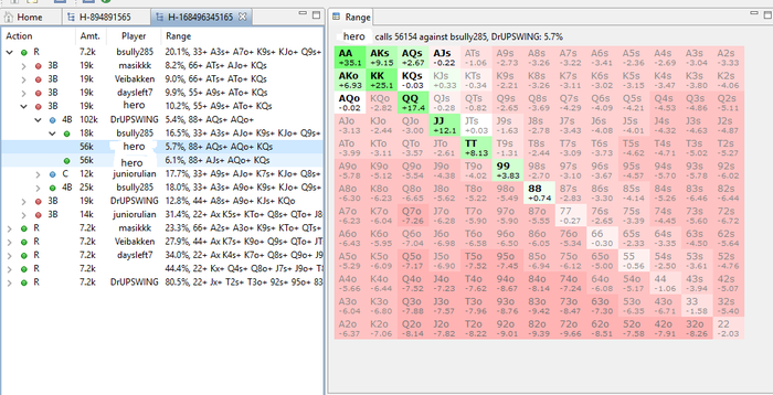 Привет всем. Вот такая раздача случилась в биге по 22. https://www.weaktight.com/h/58e52f21d39043072b8b47e8 Возник вопрос, что плюсовее выкинуть или заведомо выставиться снизу, но с хорошими шансами банка? Точнее, что из этих вариантов менее минусово? Если оставить весь расчет на ХРЦ, не лочя диапазоны, т.к. это не суть, то наш кол по AQo принесет -2evbb/100. Если же мы выкидываем, то играем -800evbb/100, или все же этот момент учтен в ХРЦ?