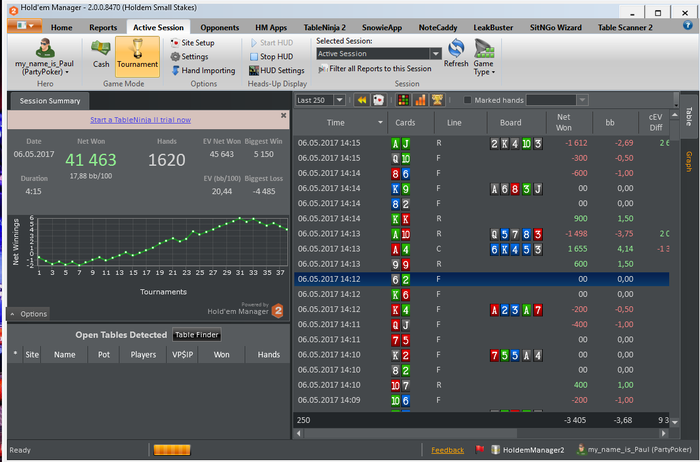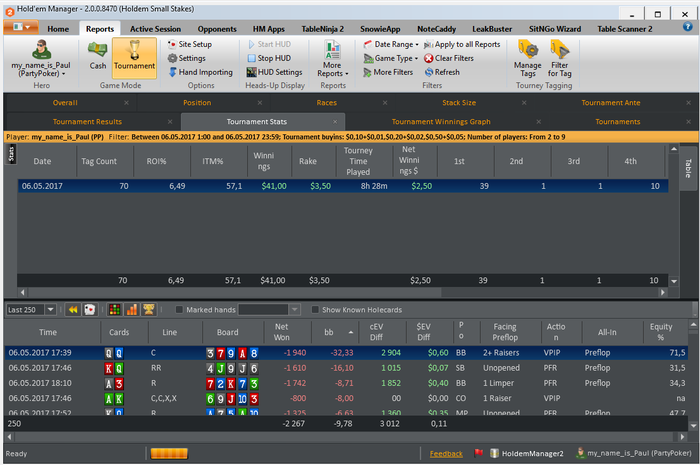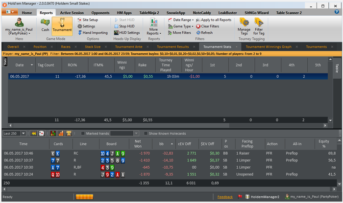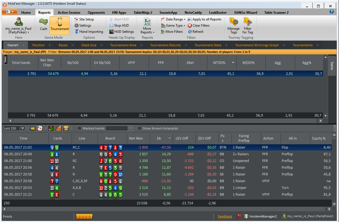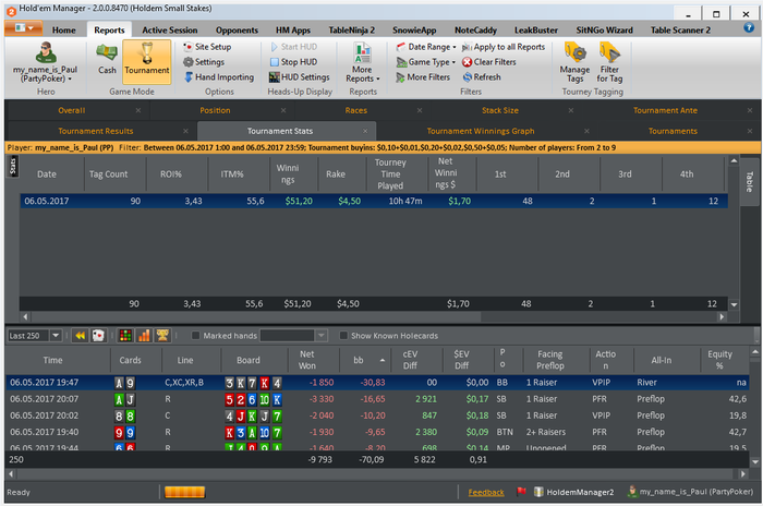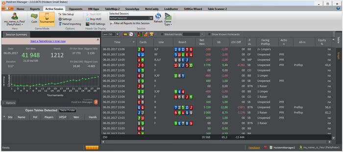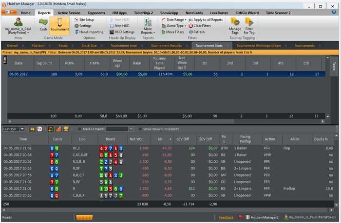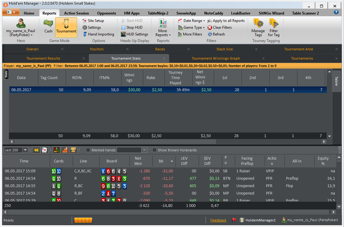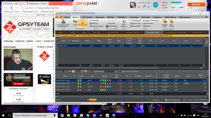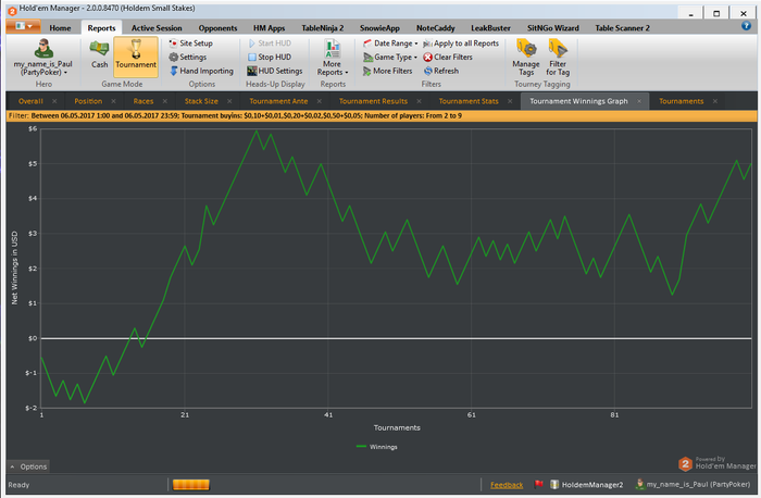 МАРАФОН ЗАВЕРШЕН) Общие итоги: -roi 9% -itm 58% -nw$ 5& -bb/100 4.94 -EV bb/100 5.16 Все результаты положительные, и в принципе не плохие. Но цели не достигнуты. И это немного не позитивно. Теперь появилось над чем работать. Сам марафон был задуман абсолютно спонтанно ( вчера вечером возникла такая мысль). И не то что бы я к нему не был готов, я был готов! Был выспавшийся, бодр, поставил все цели и планы на данный марафон. Но тот факт что это первый мой,такого рода, марафон. И нужно было постоянно начинать сессию, отбросить результаты пред идущей. Если до этого у меня было время на какой-то анализ и отдых ( т.е. сутки отдыха от покера) то сдесь было всего 5 минут на отдых абстрагирование от прошлой сессии. И это в какой то момент сказалось. это видно на графике. На третьей сессии был пиковый подъем, после чего был спад и легкий даун стрик игра устаканилась и шла в ноль. В плоть до последней сессии где мне пришлось, отключить свою музыку перезагрузить компьютер, заварить чаю( хотя и до этого то же заваривал), серьезней сконцентрироваться. В конечном итоге мне укололось вытащить этот марафон на средний результат( относительно цели). Еще было мной замечено, что упал FPP и PFR,(с 25/22 до 21/19) после первой плотины марафона. Но я думаю что это связано с осторожностью, так как попал в даунстрик, и старался минимизировать потери. Если смотреть в будущее, то на данный момент если работать в таком режиме то это довольно не просто, и все таки я еще не со всем готов к таким забегам. Если бы у мня было свободное время для покера, столько же как и сегодня, то я бы играл максимум 6-7 таких сессий. Пока не больше. Но естественно что это не придел. Всем спасибо кто читал и следил за марафоном)))))) Буду выкладывать новые марафоны и ставить более высоки задачи и цели, всем удачи!