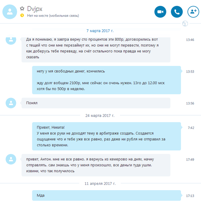 Ниже кусок беседы из скайпа, с обозначением долга.