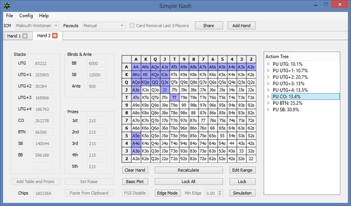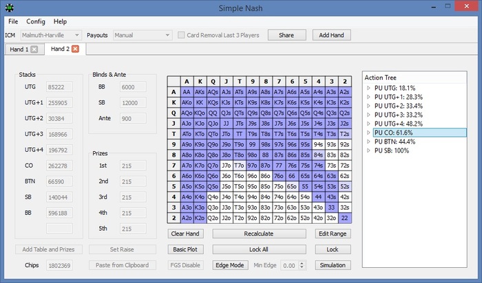 Вот результат расчета по модели Malmuth-Harville в Simple Nash (стеки на втором столе генерировал рандомно, но они не слишком далеки от истины):