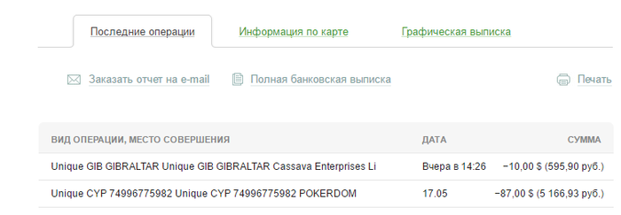 Делал депозит с карты в покердом и 888. Сегодня представитель пд попросил выслать историю по карте, так как вывод с пд не приходит уже более суток. Я зашел в сбербанк онлайн и заметил, что на карте денег стало меньше на рублей 100-135. Сперва решил, что сняли за смс оповещение, но за смски снимают 60 руб, да и никаких оповещений мне не поступало. В выписке тоже ничего не указано. И тут до меня доперло, эти твари сменили курс депозитов Хотя я точно помню, что в пд снялось что-то в районе 5025-5027 руб. при покупке 87$, ну и соотв в 888 курс был другой. Я точно не могу сказать какой был курс, тк все смски вчера перед сном удалил. Крч, пасаны, будьте бдительны.
