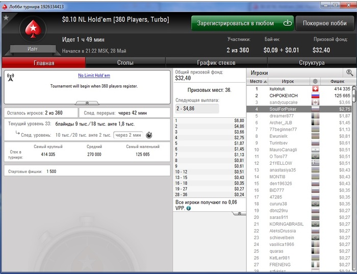 ПОКЕРСТАРС: Удалось крутануться с фрироллов, перешёл на мтснг 360макс за 0,10 $, в одном 4 место занял. Итог: раскрутился с нуля до 3,86 $.