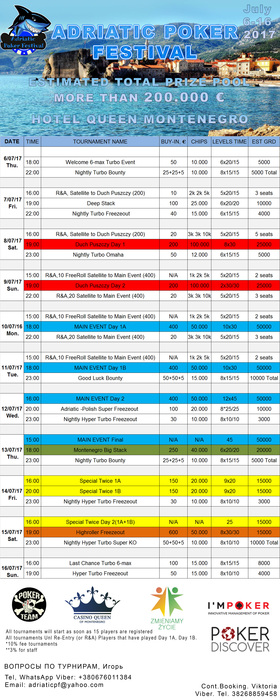 Приглашаю вас на самую летнюю серию этого сезона Adriatic Poker Festival! Демократичные байины ( в евро) , курортный кеш, чистейшее море и множество приятных сюрпризов! О сюрпризах чуть позже, пока ознакомьтесь с расписанием.