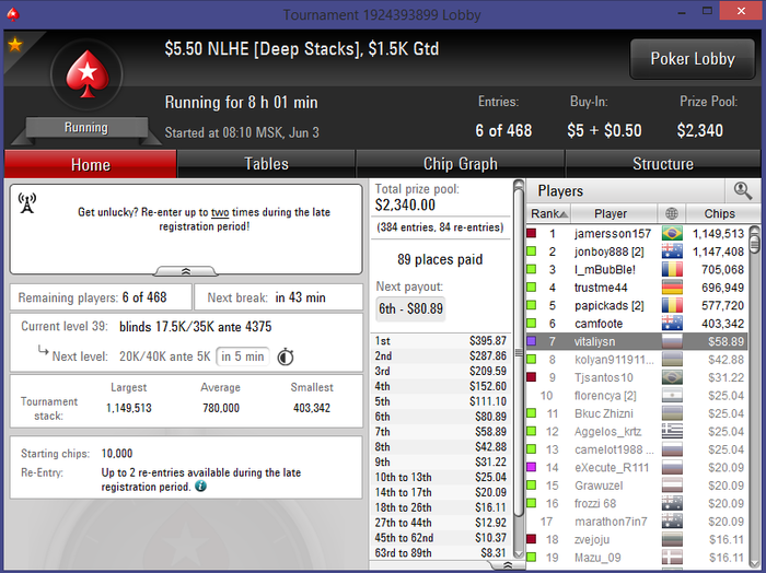 Прошел далеко сразу в 3х турнирах,но во всех сдали такое дерьмо что сделать я ни чего не мог,в 1 была возможность не проиграть большой стэк выбросив QQ на префлопе но на это мало кто способен да и играл я не в оптимальном физическом состоянии,чувствовал бы я себя не таким уставшим возможно и выбросил бы
