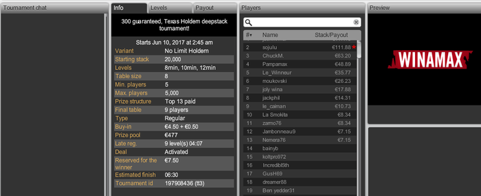 Топ 1 на винамаксе. Не очень много, но всё равно приятно. Поделили по фишкам (почти поровну когда было). Ну и я потом выиграл Там 117. Если ещё учесть что был топ 4(27 евро по моему) несколько часов до этого с бай-ином 5, то это даже очень хорошо.