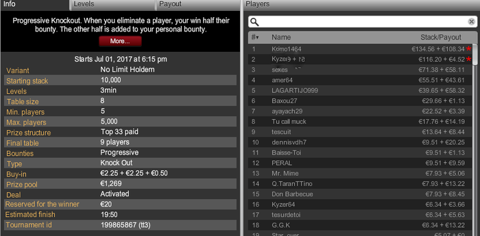 PokerStars Турнир №1924395525, Безлимитный Холдем Бай-ин: $1.00/$0.10 USD 1189 игроков(а) $584.00 USD добавлено к призовому фонду PokerStars Общий призовой фонд: $6000.00 USD Турнир начался 29.05.2017 21:15:00 EET [29.05.2017 14:15:00 ВВ]