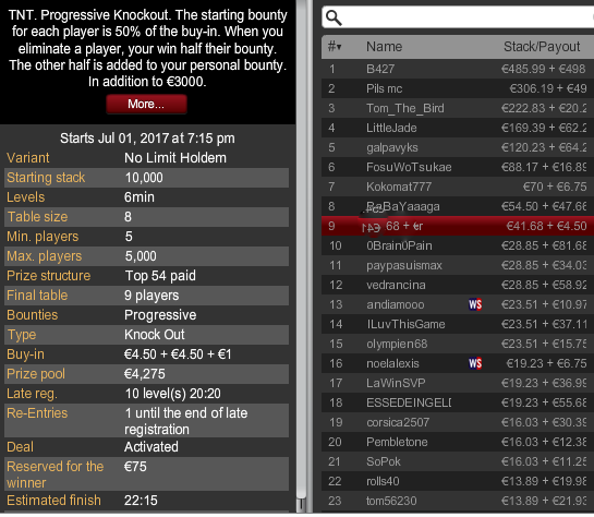 Играл 4 часа, занял 8 место из 800. Би 1 евро. И заработал 10 евро. Это фигня какая-то Отмечу конечно что это был баунти, но за 8 место 8 с чем-то евро дали-это конечно .....
