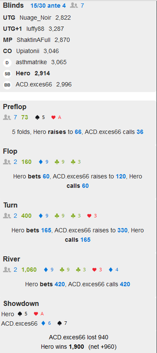 10 место в фриролле для Аллюминия(19 евро). 2.5к участников. Много правда ситаутов-что нормально для таких фрироллов. Могло быть лучше(первое 360 евро), но доигрывал с телефона(соответственно без статов), так как домашний интернет заглючил. Ну и видно тильтанул. В 5-максе с MP(первая позиция после бб) запушил A8s и СО принял с АQo. Стэки у всех были от 5 до 10бб. Скрина нет, так как со смартфона доигрывал. Ну и тильт был что не сообразил заскринить смартфоном. Таки вот дела...