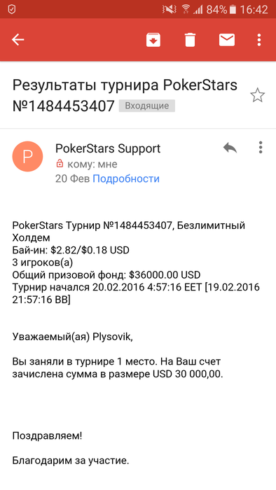 Прошёл во второй/финальный день фриролла(6-макс) с ПФ 100к. Правда всего лишь с 10бб. Да и сам второй день начнётся аж 3 сентября. По самой игре: сначала совсем не заходило. Вышло выбить двух фишей и нарастить стэк. Была конечно крупная ошибка, я забыл что во второй день проходят со стэками первого дня играл просто на проход. Но с другой стороны я не рисковал где можно было и рискнуть немного, так как видел что в 184 из почти 2к я попадаю. Когда было 20-30бб карта очень начала заходить. За пять раздач три раза раздали AKo, один раз QQ и один раз JJ. Так как я видел что я впереди и во второй день прохожу не ставил на вэлью, а просто овербетами/олл-инами забирал банк на флопах и тёрнах. Хотя в нескольких случаях доски были опасными и вполне вероятно на вэлью могли заколлировать.