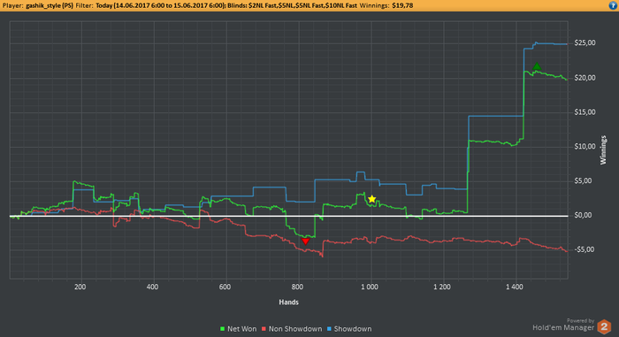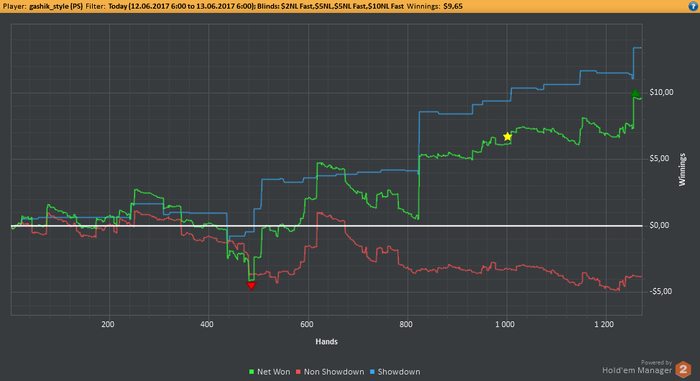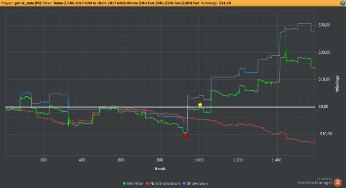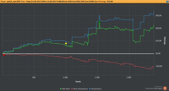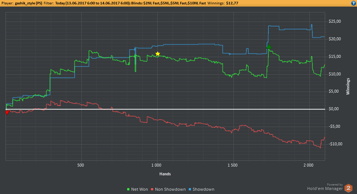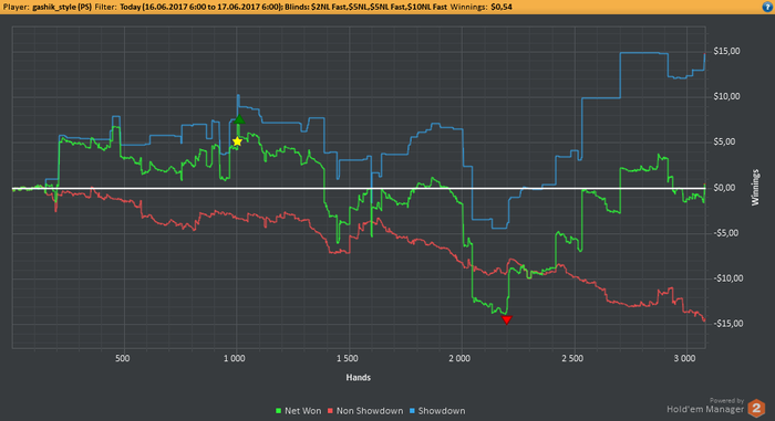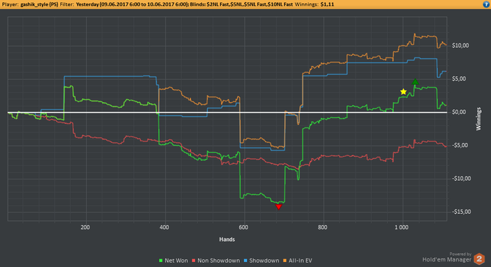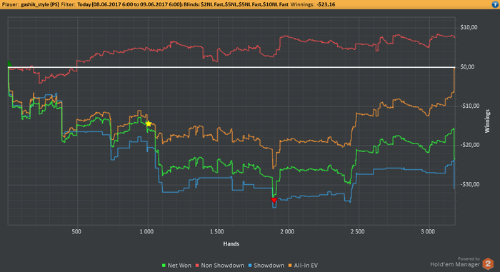 EELFF, Привет. Стараюсь выбирать ситуации для блефа, но вчера творил много бреда. На работе клиенты нервы пошатали, вот я и сорвался за столами) Но честно говоря и здавало вчера отвратительно. На вскрытии нихера выиграть не мог.