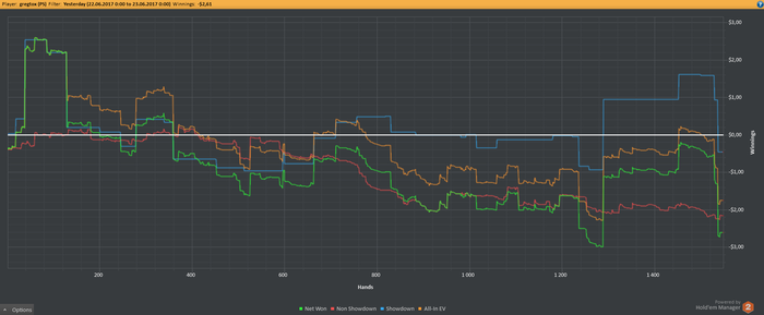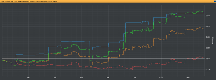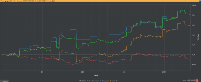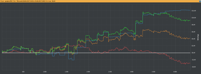 Очень часто заходили старшие и средние пары,флоп выходил лютый,приходилось фолдить,не доезжали дро...ну и все такое нытье в общем...короче незначительно минусанул. Вот график
