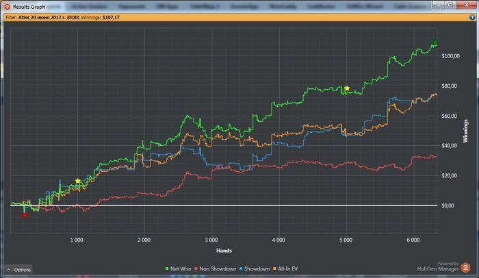 Упал до -8 (на NL5 SB vs BB не смог выкинуть АК на 5бет пуш, там QQ... терн K, ривер Q) и плюс на NL10 с АА проставил три ставки на сухом борде, там колин стэйшен покупает вторую пару...