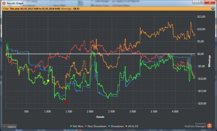 Мда, отморозился я сегодня будь здоров... отыграл 4457 рук, сессия неудачных 4бет-потов, то вторую пару накрутят, то сет 99 в тузов, ранер ранер стритаа... но каюсь и сам сделал пару грубейших ошибок, без которых бы откатал в ноль или слабый плюс...