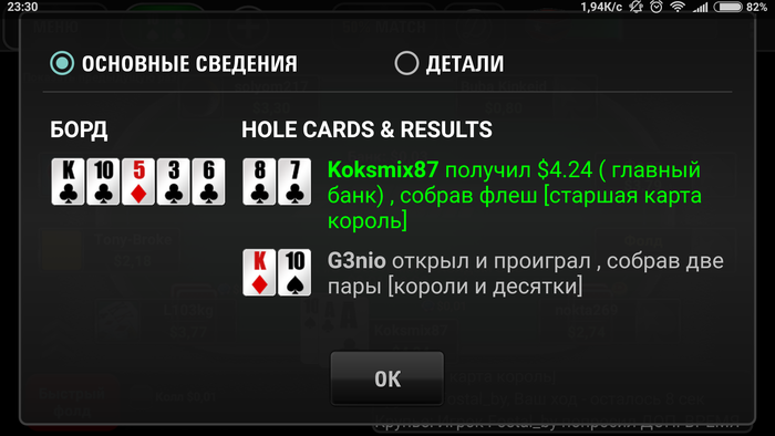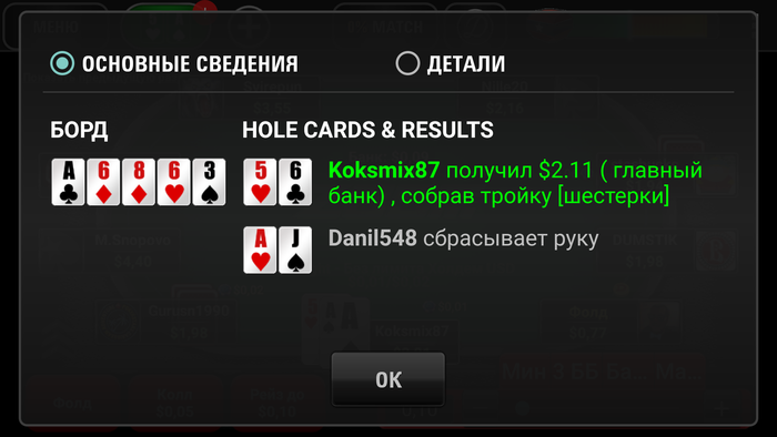 -31 цент, играл минут 30 . Начальный стек 2$. Доигрался до того что осталось 48 центов и я поставил один с 99 против АА. Ну и мне повезло, я собрал сет. Потихоньку начал подниматься и вот уже 1,69$ и я решил остановиться. Так как пора домой. Всем удачи