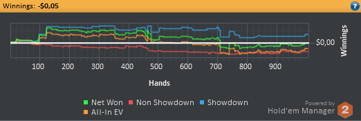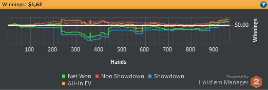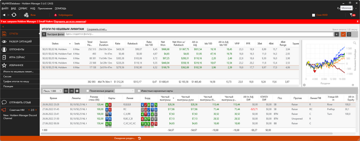 Откатал небольшую часовую сессию, результаты прилагаю Проиграл выставление АА в КК на префлопе на 200бб, монетку QQ в АКo на 100бб против агрессивного оппонента, и выставился c JJ в АА против оппонента со стеком в 60бб. Итого БР 80.00$, отдыхаем и продолжаем.