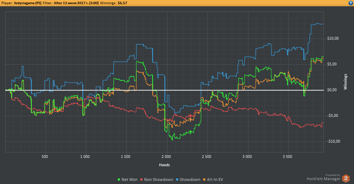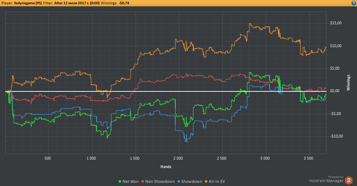 Играю в данный момент на Pokerstars с ником fedyniagame. С момента создания блога я во многом преуспел, прошел обучение у Петра aka BoggartYork на курсе PokerPro, успел накатать приличную дистанцию на NL2, довольно скромные дистанции на NL5-10, и сейчас начинаю осваивать NL25. Катаю 6max рег столы, результаты такие: