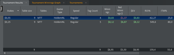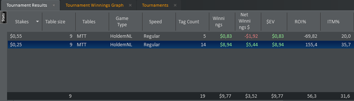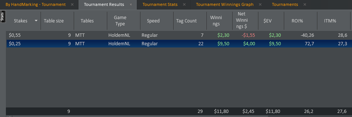 Всем привет, хочу месяц посвятить чисто турнирам, раньше играл мтт, но очень мало из-за своей природной лени и паршивой дисциплине.) Обычно садился играть с мыслями, что сегодня нужно сыграть хотя бы 5 турниров, но вылетев из первого, с мыслями да пошло оно все, отменял регистрацию. из заносов 4 место в Биге 0.55. и все.) Примерно такая же картина складывается в кэше, не хватает дисциплины наигрывать нормальную дистанцию, в следствии этого не получается вылезти из микролимитной трясины. Могу сыграть за сессию 1000-1500 рук, а могу и 200 ( если какой-нибудь отмороженный чувак подарит свой стек, я думаю типа ну вот, плюсанул, надо сделать перерыв, а после перерыва думаешь, что и так неплохо сыграл сегодня, с этими сладкими мыслями и закончу на сегодня, какой я молодец, а там еще и новая серия твин пикса вышла, в итоге лень перебарывает меня) . Может просто кэш долго катать становится скучно Результат чуть меньше, чем за месяц.