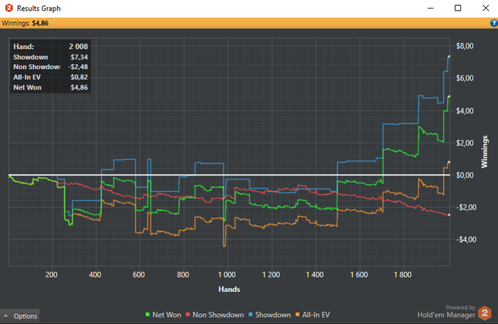 Примерно такая же картина складывается в кэше, не хватает дисциплины наигрывать нормальную дистанцию, в следствии этого не получается вылезти из микролимитной трясины. Могу сыграть за сессию 1000-1500 рук, а могу и 200 ( если какой-нибудь отмороженный чувак подарит свой стек, я думаю типа ну вот, плюсанул, надо сделать перерыв, а после перерыва думаешь, что и так неплохо сыграл сегодня, с этими сладкими мыслями и закончу на сегодня, какой я молодец, а там еще и новая серия твин пикса вышла, в итоге лень перебарывает меня) . Может просто кэш долго катать становится скучно