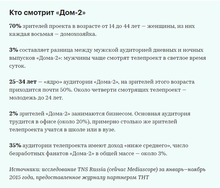 Каждый день ТНТ выделяет «Дому-2» 4,5 часа эфирного времени — утренний, вечерний и ночной выпуски, последние два следуют друг за другом. При упоминании названия передачи прогрессивная общественность обычно брезгливо морщится, но со статистикой не поспоришь: за драматическими обсуждениями вроде «считается ли изменой SMS «бывшей» в среднем за 13 лет следил каждый одиннадцатый россиянин старше четырех лет, включивший телевизор во время трансляции реалити-шоу (данные Mediascope).