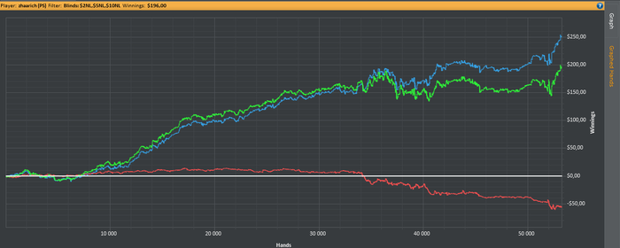 Отыграв 30к рук на нл2, я начал подключать нл5 и нл10(если только за столами сладкие фиши).При достижение нужно банкролла оставлю онли нл10. Хочу выложить график от начала обучения до настоящего времени