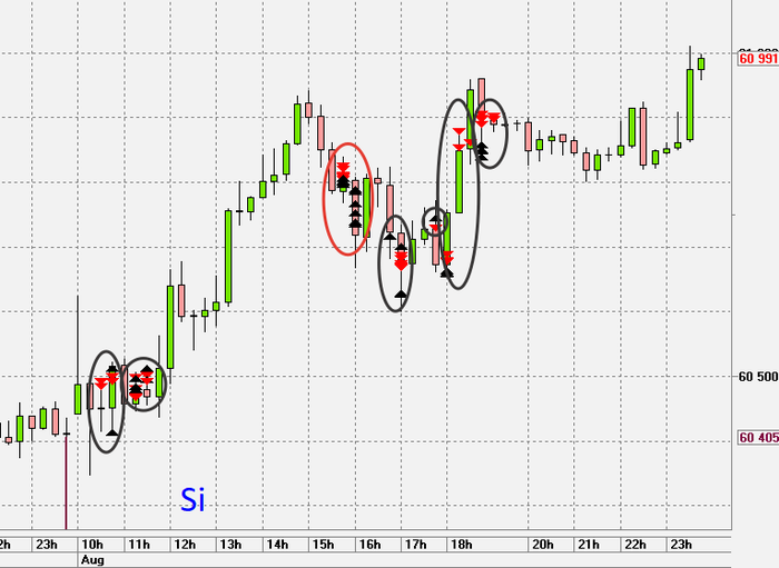 Красным кружочком - сделка на продажу, чёрным - на покупку.