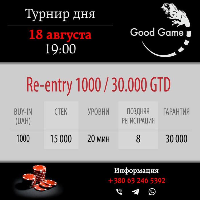 Внимание! Внимание! В воскресенье, 20 августа, из-за футбольного матча ЧУ "Динамо" - "Сталь", нужно будет предварительно подтвердить свое участие в турнире (ребайник по 200 грн, старт в 17:00). Все желающие сыграть в турнире должны написать свои имя и фамилию до 00:00 19 августа. Сделать это можно здесь, а также в нашей группе в Facebook (в личных сообщениях), в группе Good Game в Вайбере или сообщить менеджеру клуба лично или по телефону 063 2465392. Всех, кто собирается играть в воскресенье, пропустят по списку. Можно будет еще и футбольчик глянуть одним глазком!