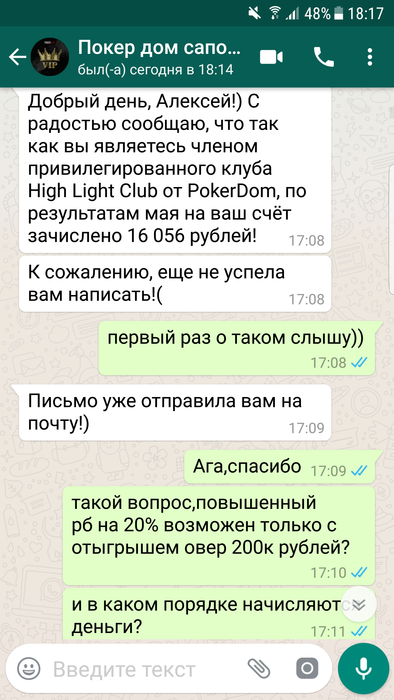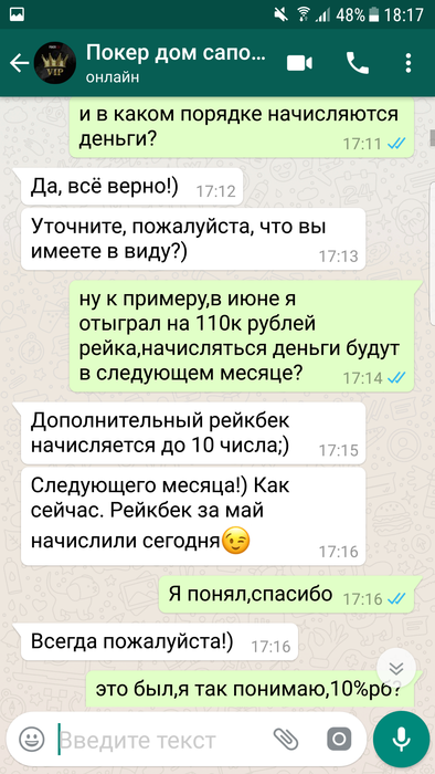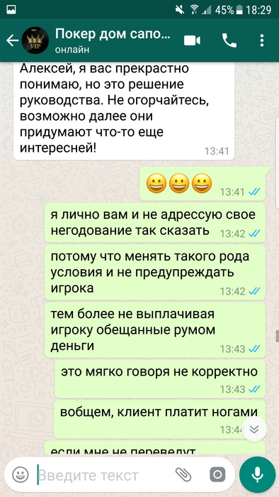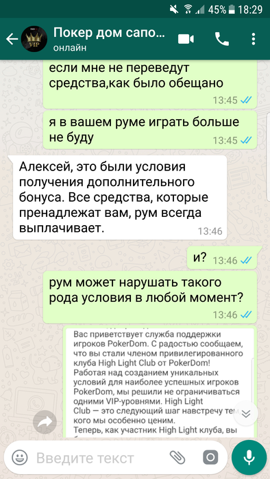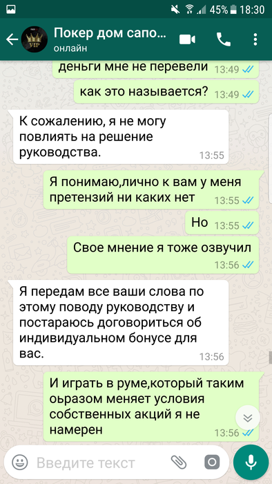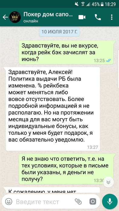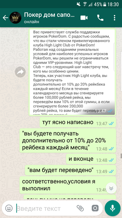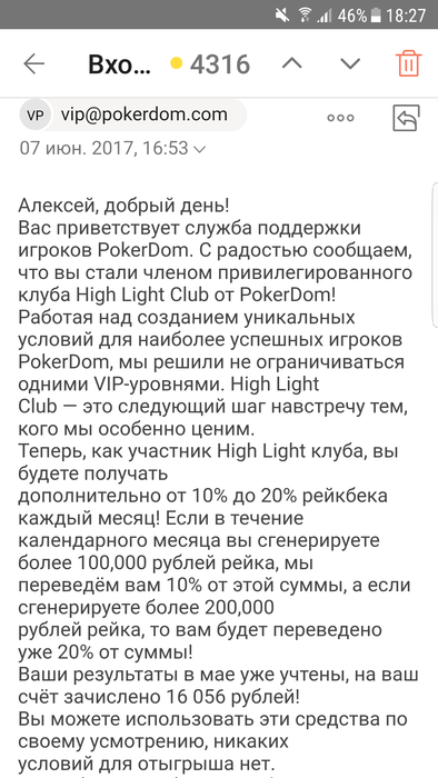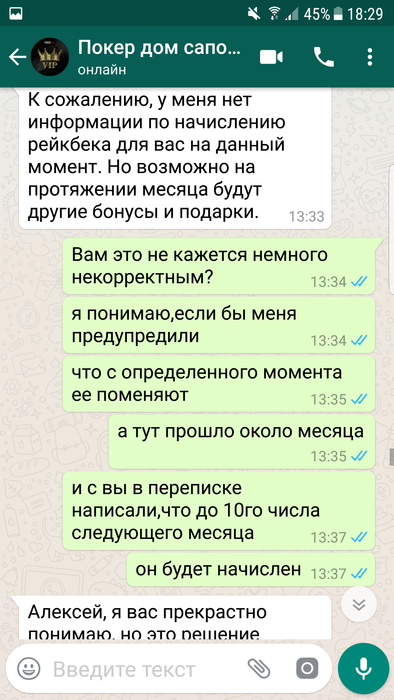 Всем доброго времени суток,меня зовут Алексей ,играл на ПД около 2х лет под ником LikeLeo, до одного весьма неприятного инцидента. 7 июня мне на почту приходит письмо, согласно которому "Теперь, как участник High Light клуба, вы будете получать дополнительно от 10% до 20% рейкбека каждый месяц! Если в течение календарного месяца вы сгенерируете более 100,000 рублей рейка, мы переведём вам 10% от этой суммы, а если сгенерируете более 200,000 рублей рейка, то вам будет переведено уже 20% от суммы!". Эту новость я обсудил с саппортом, где мне ответили, что дополнительный рейкбек начилсяется до 10 числа следующего месяца. Наиграв руму немного более 200к рейка за июнь, я ожидал начисления обещанных средств. Поскольку никаких сообщений от рума не было, как и обещанного дополнительного 20% рейкбека, я отписался в сапорт 10 июля, где меня несколько удивил их ответ, а именно "Политика выдачи РБ была изменена. % рейкбека может меняться либо вовсе отсутствовать. Более подробной информацией я не располагаю,но на протяжении месяца для вас могут быть индивидуальные бонусы, как только у меня будет подарок,я вас обязательно уведомлю.". Разумеется, такой ответ меня более чем не устроил, как и тот факт, что рб мне не перевели, и не собираются перевести, лишь обещая непонятные бонусы и подарки в дальнейшем, и оправдывая данное действия рума, аргументируя это тем, что "условия поменялись, такое бывает, но вы не растраивайтесь. ". Вобщем, моя главная претензия к руму заключается в том, что, во- первых, выполнив свою часть "сделки", рум не перевел обещанные ими же средства, во-вторых, рум не уведомил меня надлежащим образом, а лишь поставил перед фактом, что данную акцию упразднили, и денег по ней я не получу, в-третьих, рум по всей видимости даже не попытался корректно решить данную проблему, лишь обозначив свое наплевательское отношение к игроку. Напоследок хочу написать, что в целом, у меня было довольно лояльное отношение к покердому, за все время моей игры там, мои проблемы решались, пару раз переводили деньги на счет при обрыве интернет соединения, да и вцелом работа саппорта положительных отзывов заслуживает ( по моему опыту разумеется), но данный эпизод полностью перечеркнул мое отношение к руму.
