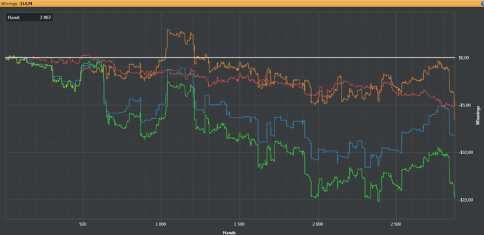От депозита остался только 24 коина,проигрывал большинство раздач бразильцам и немцам,просто нереально им заходит на ривере,что в кеше что в спинах,как будто у тебя не 80% на выигрыш а 20%,и этот бесконечный постоянный туз на борде,гсч просто обдирает по полной,подставы кулера бед биты,такое ощущение что вся эта программа охуенный развод на бабки ,как это еще назвать не знаю. Ну чтож я сделал единственный разумный и правильный для себя вывод,написал письмо в саппорт и попросил удалить аккаунт,желание играть в покер там где есть развод мне не хочется,и ради нищих сундуков +4 коина или ради 0,50$ Болта подавно,а развлечений по мимо покера в жизни полно,всем удачи!!!