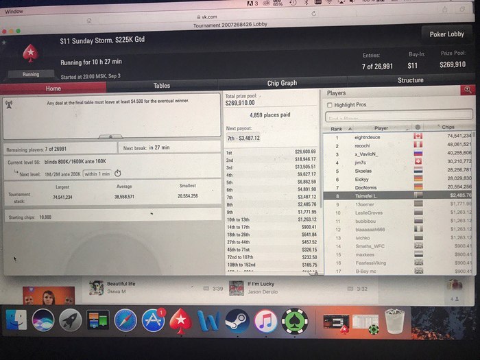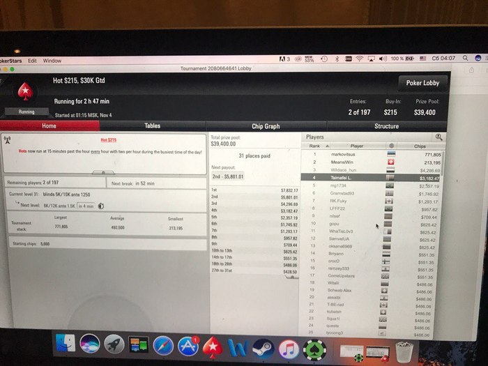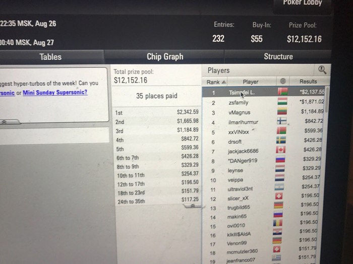 Довольно забавная история случилась, когда в игре оставалось 11 человек. Паренек с другого стола... Посмотрел на стеки за нашим столом и бросил фразу: "Похоже на финале я буду огромным чип-лидером". 9 человек попали в призы. Кто стал бабл-боем думаю понятно :)