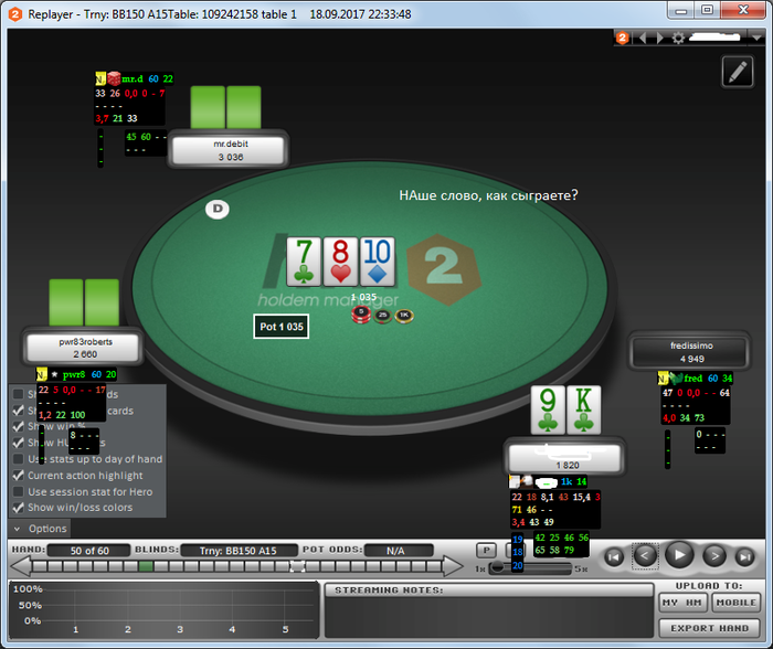 В первой колл (эффективный стек 10,5 ББ при низком ИЦМ факторе, а рука А8с явно должна попадать в равновесии Неша батона против СБ), во второй пас изи, как тут можно вообще рассматривать иные опции, при 12 ББ эффективного стека и трэш рукой, будучи коллером?, в третьей тоже, так как опенрейзер (скорее всего лузово-агрессивный регуляр) скорее всего в натсах, а 66 явно позади его спектра рейз/колла, в 4-й тоже бы пушил на флопе овербет пушем ,генерировав по максимум ФЭ и имея под 50% прямого эквити в ИЦМ ситуации. Пуш тут идеально, я почти уверен.