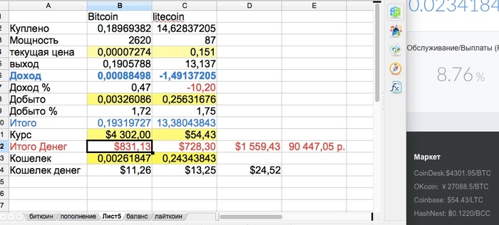Итак я обменял 93700 рублей на биткоины и лайткоины и купил себе мощности.