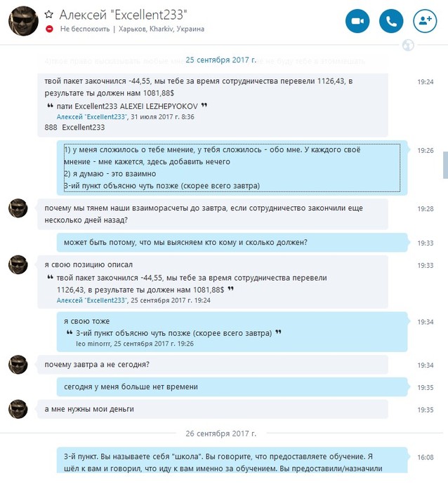 Как видно из переписки, Алексей "Excellent233" не дал ни одного ответа по существу на мои вопросы/высказывания/аргументы/претензии.