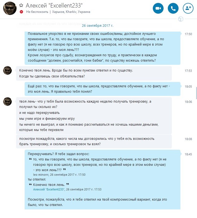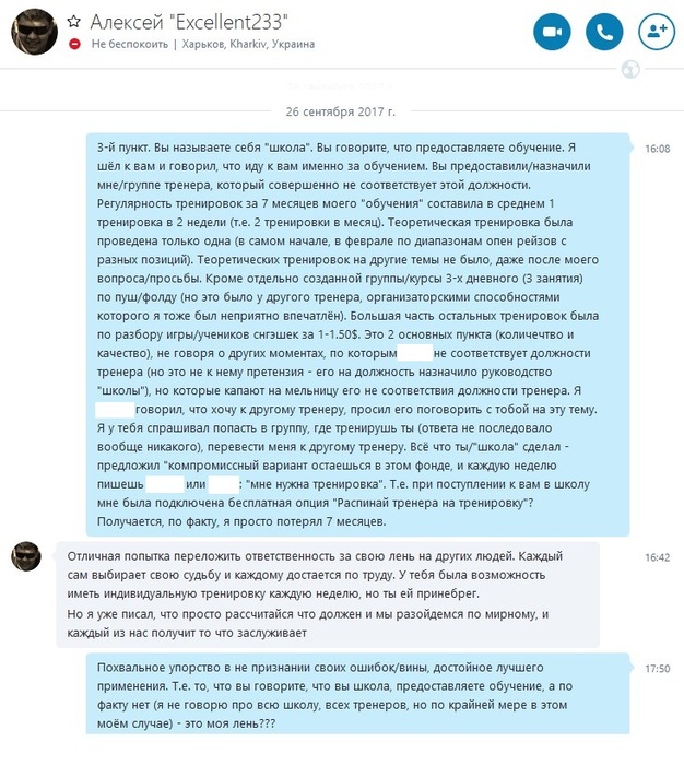 3) Я думаю имеет смысл выложить не часть, а всю переписку потому, что будут возникать вопросы, которые мы с Алексеем "Excellent233" в скайпе уже обсуждали. Конечно же, не всю переписку за всё время, а по сути данной темы. Если Алексей "Excellent233" решит, что я выложил не всё по сути данной темы, пусть выкладывает всё, что посчитает нужным. Единственное я затёр имя тренер(а/ов) потому, что не хочу их называть.