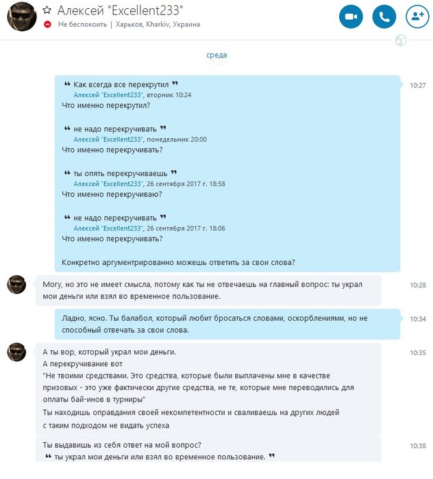 2) По поводу части переписки. В том то и дело, что это часть переписки, вырванная из контекста. Алексей "Excellent233" назвал мои действия воровством и дал ссылку на википедию, где даётся определение воровства из уголовного права. Я ответил определением имущества, права собственности, кражи/воровства оттуда же, из права (откуда он мне определение дал, оттуда же я ему и ответил). Но у нас бэкинг не регламентируется никакими законами, правовыми нормами. Участники руководствуются договорённостями и ... здравым смыслом что-ли. Поэтому я и не говорю, что это мои деньги и точка. В последнем предложении моей цитаты из под спойлера я же и говорю, что не отрицаю его право/требование этих денег как выполнение договорённостей/моих обязательств по расчёту.