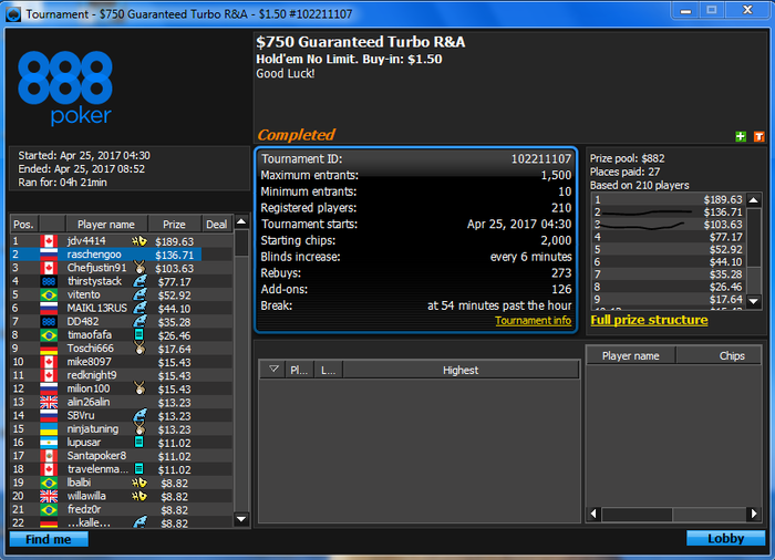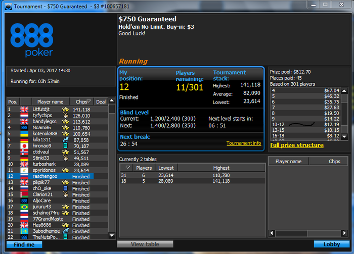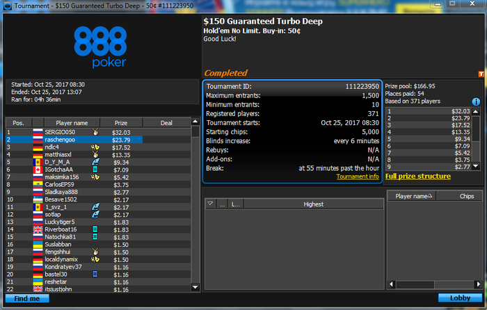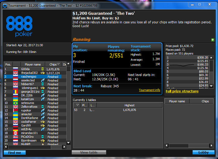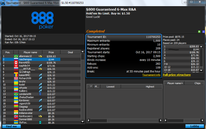 благо по старому курсу , хотя в принципе это особой роли не играет наверно , кстати подобной писаниной я никогда раньше не занимался , не судите строго за красноречие , Весной я решил подзабить на покер старс и перейти в другой рум , остановился на 888 тк аккаунт на них был зареган давно а я не играл просто из за некачественного софта . наверно все согласятся что в софте лидируют старзы и именно по этому они удерживают большую часть игроков , даже играющих в слабый минус . каким не был я ( я играл в хороший минус ) , почему я залил столько денег на старзах намечается наверно у некоторых вопрос , да потому что я как и очень многие считал что мне не везет , меня переезжают и тд и тп . + к тому я никогда не играл по бр , за что себя виню , есть ли только в этом смысл хз . в последнее время уделяю много внимания изучению игры и психологии поведения человека , тк определенные лики в психике отлично отражаются в результатах игры , тильт и тп . в коем я пребывал не 1 десяток раз , что удивительно от этого никогда не страдала моя орг техника , Итак , что имеем сейчас , за время проведенное на 888 сыграно около 1к турниров .
