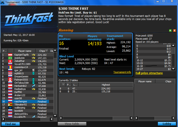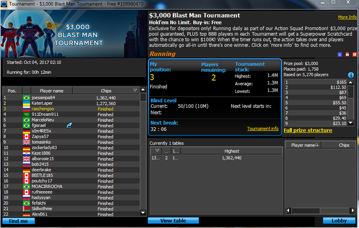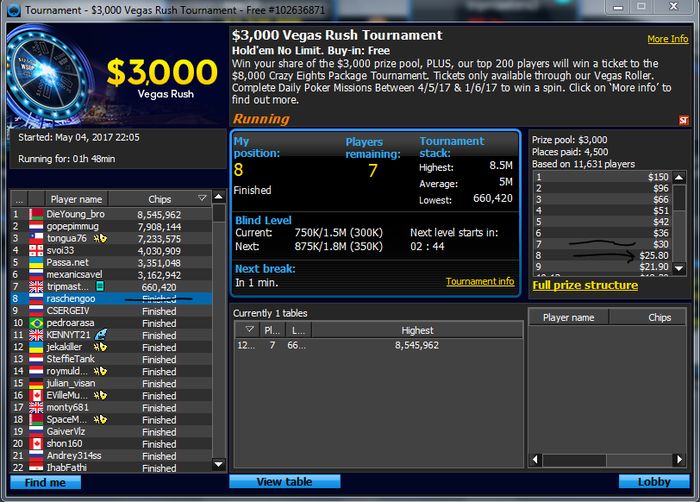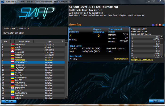 к сожалению я опять не придерживаюсь бр менеджмента и трачу большую часть выигрышей на лайф в связи с чем банкролл приблизился к 0 отметке , придется как-то подниматься с фрироллов , а может ты мой юный читатель захочешь мне помочь в достижении цели и поделишься парой баксов ? буду очень благодарен помочь везунчику жми сюда