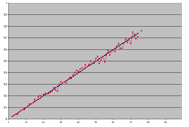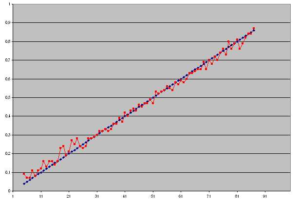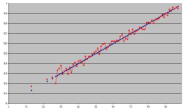 - Весь диапазон вероятности от 0 до 100 делился на 100 полосок шириной 0.01. Если для полоски в базе оказывалось более 100 игр, то для нее вычислялось реальное значение вероятности для исхода П1, как отношение числа побед 1 к общему числу игр. Если игр было меньше, то для полоски записывалось пустое значение.