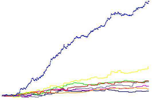 Для эксперимента брались рынки П1 и П2 для футбола. За год. Считалась прибыль на каждый день. Понятно, что для каждого дня недели-графика он есть ступенчатый (прибыль один раз поменялась, а потом 6 дней подряд та же). Это чтобы наглядно потом сложить. Два суммарных графика ниже.