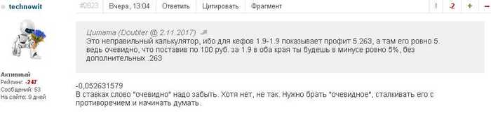 Это общая ситуация. Сегодня в блоге у димка чел наивно спросил о марже. Почему для 1.9 она не 0.5. Я ему написал, чтобы думал. Потом меня прикрыли и я в личку ему дописал. - Маржой просто договорились называть разность между 1 и суммой обратных кэфов. - Маржа не есть профит букмекера. - Профит букмекера выражается через маржу соотношением профит = маржа / (1 + маржа) Не вполне точно, но сказал главное: маржей назвали то выражение, оно не есть профит. Димок не хочет, не может, не знаю, почему, но рассказывать вот такие рабочие моменты у него не получается, он хочет чтобы обтекаемо все пошло)
