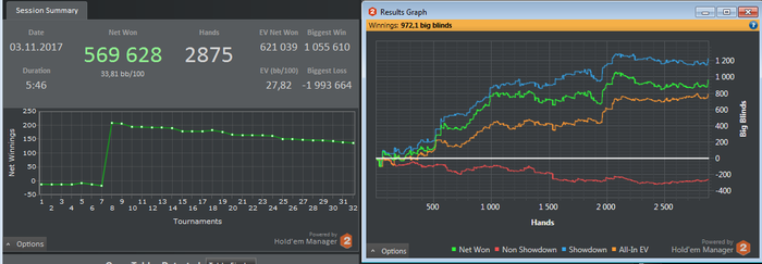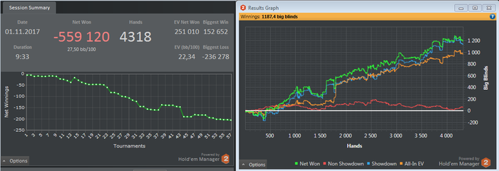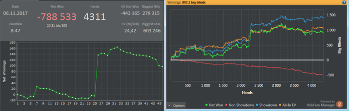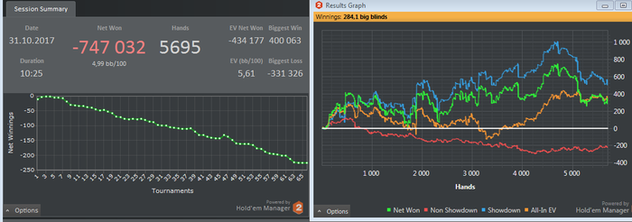 С моей игрой произошли кардинальные изменения. В Начале сентября стал играть на Бвине, и понеслось: спектры пре\постфлоп сбились, понимание ситуаций пропало, да и вообще черте как играть стал. Что делать не зню. Может меня подкосило, что у меня 3-5% итм на Бвине был?-Хз. Наверно это пустая трата времени искать из-за чего. Нужно устранить проблему! Звучит красиво,гордо. Вот только что менять то? Ааааа, бесит, когда нет уверенности. Хочется, чтобы все было просто: засовываешь оппам за щеку и они причмокивают,а ты гребешь лаве и не чешешься о всяких приблудах,спектрах-мектрах. Вот приколюка сегодня была. Вышел на преФТ дипа, на 8ках : 8 ребят сидит со статой 17\10 (!!!), на стилы сдаются, трибета нет, на постфлопе падают, проход до шд 27% ( +- пару %,а так статы идентичные, практически). ЛОЛ,бл**ь, как за таким столом можно насасывать ?!!!!!!!! ЗА две раздачи- в топ17- потерял 60 бб (было 115бб). Дальше, больше. Стилю в чудика с зашкаливающим фолдом блинов : На трибет,на колл,на ***** Что-то не то творится. Лан,проехали. Ничего страшного. Стек болтается в районе 35-40 бб. С таким стеком и таким столом - изи игра. Печатать ббшки можно особо не напрягаясь. ПХАХАХА! Это в теории, смотря на стол и показания статистики можно сделать вывод. По факту меня изнасиловали практически все кто сидел за столом. ДАдадада , сам на ошибался и т.п. я же не говорю ГСЧ,даунтсрик, грязь, ну только если чуть-чуть Нечасто выпадает возможность поиграть дип стадию с такими оппами. К сожалению эту возможность я не смог реализовать, что меня очень сильно огорчает. Как так-то?! Чувствую себя днарем. Слава богу, что это чувство пройдет. Не хотелось бы жить с этой мыслью Шутки,шутками,а надо закидывать граф и идти отдыхать. Наигрался я сегодня...