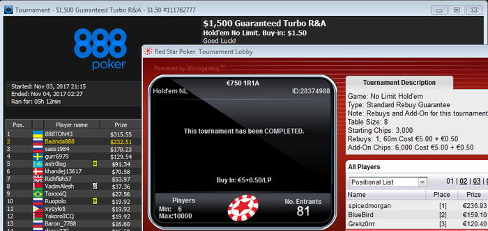 Вот так и играем :) Много дипранов было, но только один смог реализовать, на ПАти . Топ2 в ссанинке на Реде не в счет, поэтому без скрина. На 8ках было 3 финалки, везде ссаные места занял . Сыграл в поздней стадии отвратительно. Огромное количество ошибок. Зачем я совершаю какое либо действие,а потом думаю ? ДА и оппы попались гипер агрессивные. Ни пре, ни постфлоп не сдавались. Бахали тремя баррелями постоянно. В общем насиловали меня,как могли.