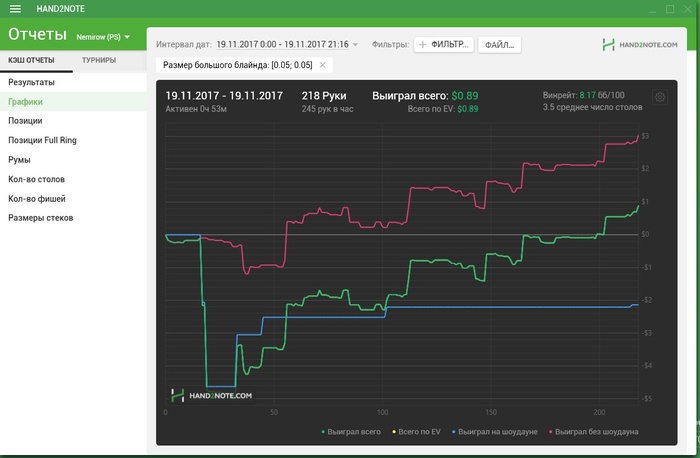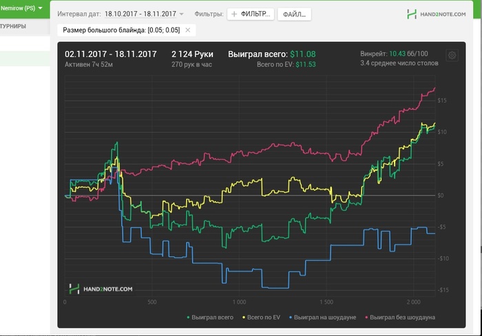 nesimeshok, Спасибо. я тож поиграв тройки на пати чет как то не в восторге. Старзы лучше все таки я с тобой согласен. Кстати пока hand2note настраивал играл $0,25 вот график