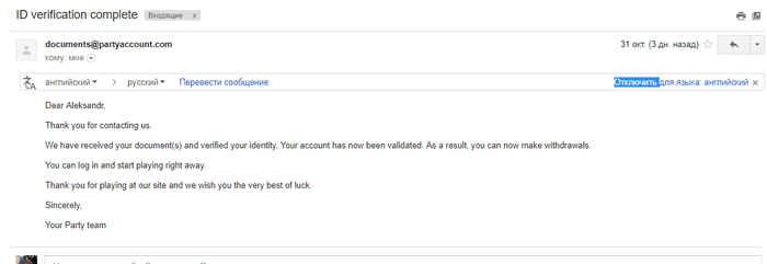 В соответствии с нашей политикой было принято решение закрыть Ваш счет, который теперь помечен и запрещен на всех наших брэндах.