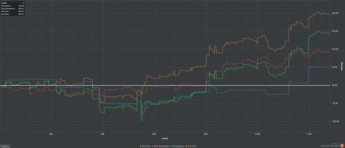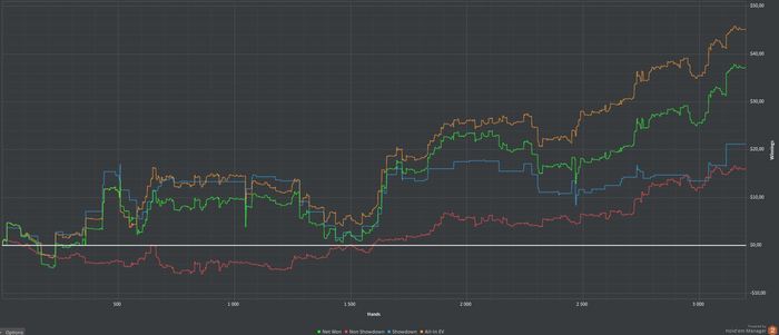 Неделя получилась стрёмная. БР просел не сильно, но мое состояние было критическим. А все из-за подстав типа сет в сет или когда карта ривера улучшает мою руку до двух топ пар, а фишу закрывает флеш и я уже не могу скинуть на его ставку. Короче я сгорел. Я проклинал эту игру и чувствовал себя беспомощным. Казалось кулеров было оооочень много. Залив 5 БИ за сессию я спустился на NL2, хотя БР позволял не делать этого. Потом играл NL5 MSS чтобы сократить потери. С этого момента начались переезды в мою пользу и я вернулся к BSS. Но я до сих пор чувствую неуверенность, поэтому решил установить стоп лосс. Не важно сколько рук сыграно, если я теряю 1 БИ я закрываю столы и возвращаюсь позже. Стоп лосс на день - 3 БИ. Посмотрим что из этого получится.