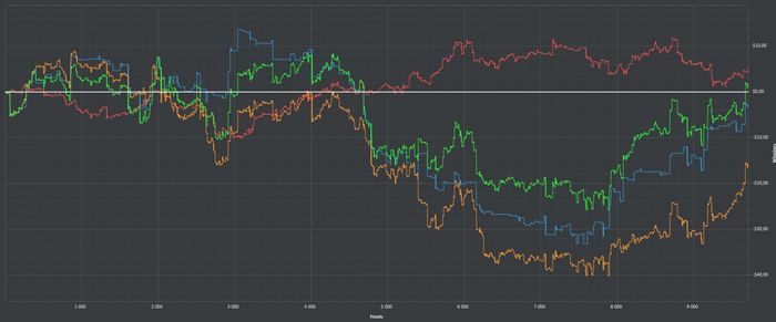 Завтра хочу поиграть побольше столов стопкой. Да моя игра будет не такой качественной, но я хотя бы перестану исполнять. Я часто блефую и пытаюсь забрать слишком много банков. Красная ползет вверх, но страдает синяя. Играя столы стопкой, у меня меньше времени на обдумывание действий, поэтому приходиться принимать более стандартные решения. Красная держится около нуля и я меньше тильтую.