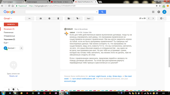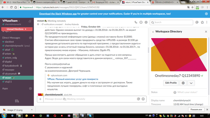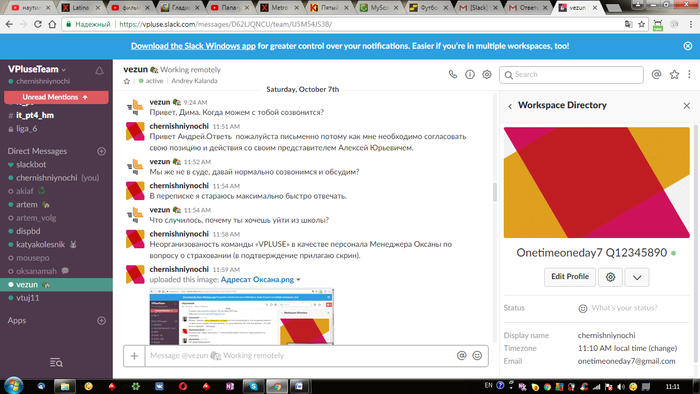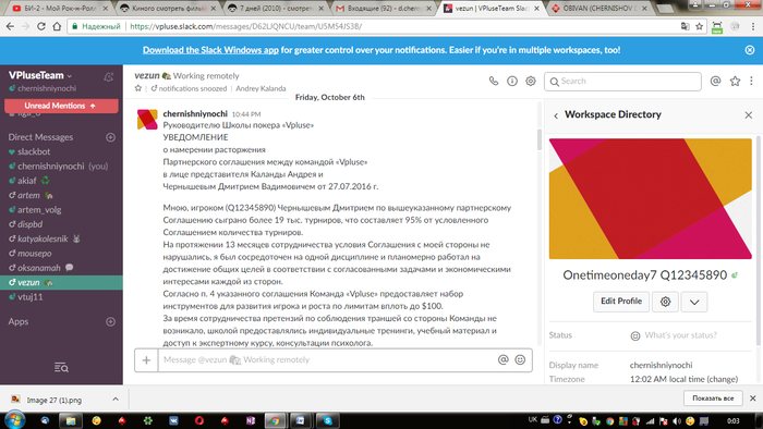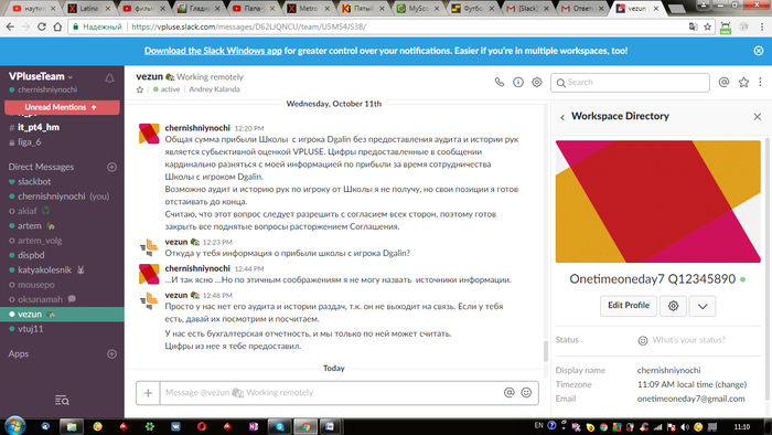 От созвона он отказался, отвечает в слеке очень редко, половину вопросов пропускает и складывается ощущение, что он просто тянет время. Поэтому продолжать диалог будем тут.