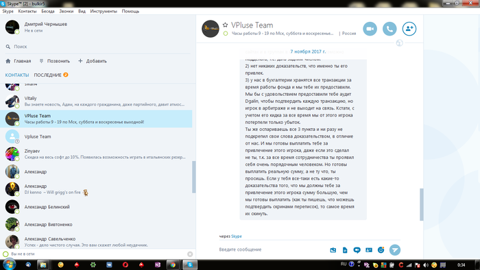 Дмитрий долго учился в нашей школе, всё было хорошо. Но потом он начал настаивать что мы его плохо обучаем. Мы предложили расторгнуть соглашение без каких-либо штрафов. Попросили вернуть транши и провести последнюю дележку. Он отказывается от рассчета и настаивает на том, что мы должны ему деньги по партрнерской программе, за то что он привлек игрока Dgalin (который уже в арбитраже) 16 августа 2016 года. На 16 августа у нас не было партнерской программы. Это доказывают новости на наших сайтах: (ссылка1 ссылка2).